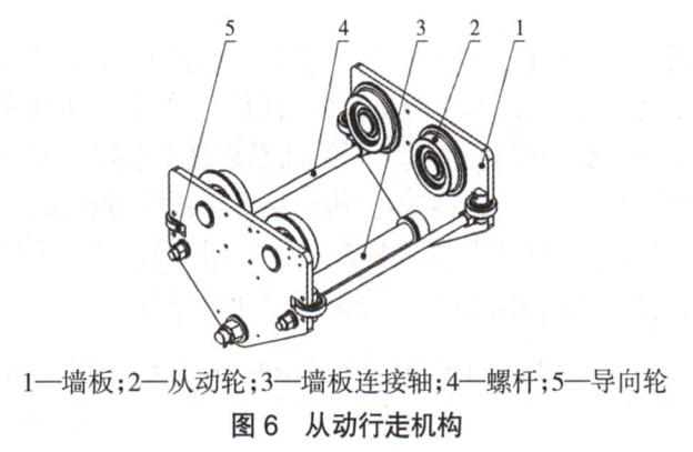 從動(dòng)行走機(jī)構(gòu)不提供動(dòng)力,主要作用是從結(jié)構(gòu)上保持葫蘆行走過程的穩(wěn)定。主要結(jié)構(gòu)如圖6所示,2個(gè)墻板、1個(gè)墻板連接軸以及2個(gè)螺桿組成從動(dòng)行走機(jī)構(gòu)的主框架,每個(gè)墻板上分別固定有2個(gè)對(duì)稱布置的從動(dòng)輪,和2套導(dǎo)向輪,從動(dòng)輪踏面直徑和主動(dòng)行走輪踏面直徑保持一致,保證在葫蘆行走過程中,從動(dòng)輪和主動(dòng)行走輪同步運(yùn)行。